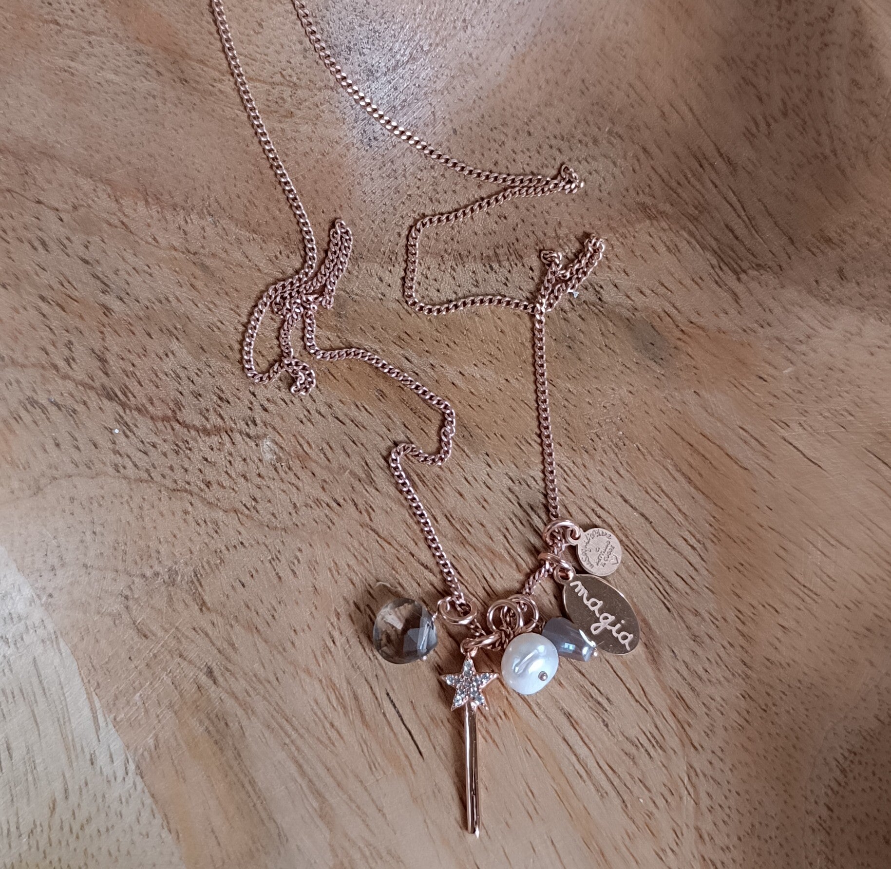 Collana realizzata in argento 925 nickel free galvanizzato oro rosa con inserimento di bacchetta magica in zirconi, targhetta parolina "magia", perla, goccia quarzo fumé e cristallo.